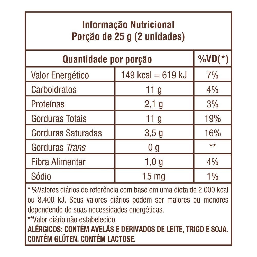 – Chocolate ao leite (30%), (açúcar, manteiga de cacau, leite em pó, massa de cacau, emulsificante lecitinas, aromatizante), avelãs (28,5%), açúcar, óleo vegetal (palma), farinha de trigo fortificada com ferro e ácido fólico, soro de leite em pó, cacau em pó parcialmente desengordurado, sal, emulsificante lecitinas, fermento químico bicarbonato de sódio, aromatizante.